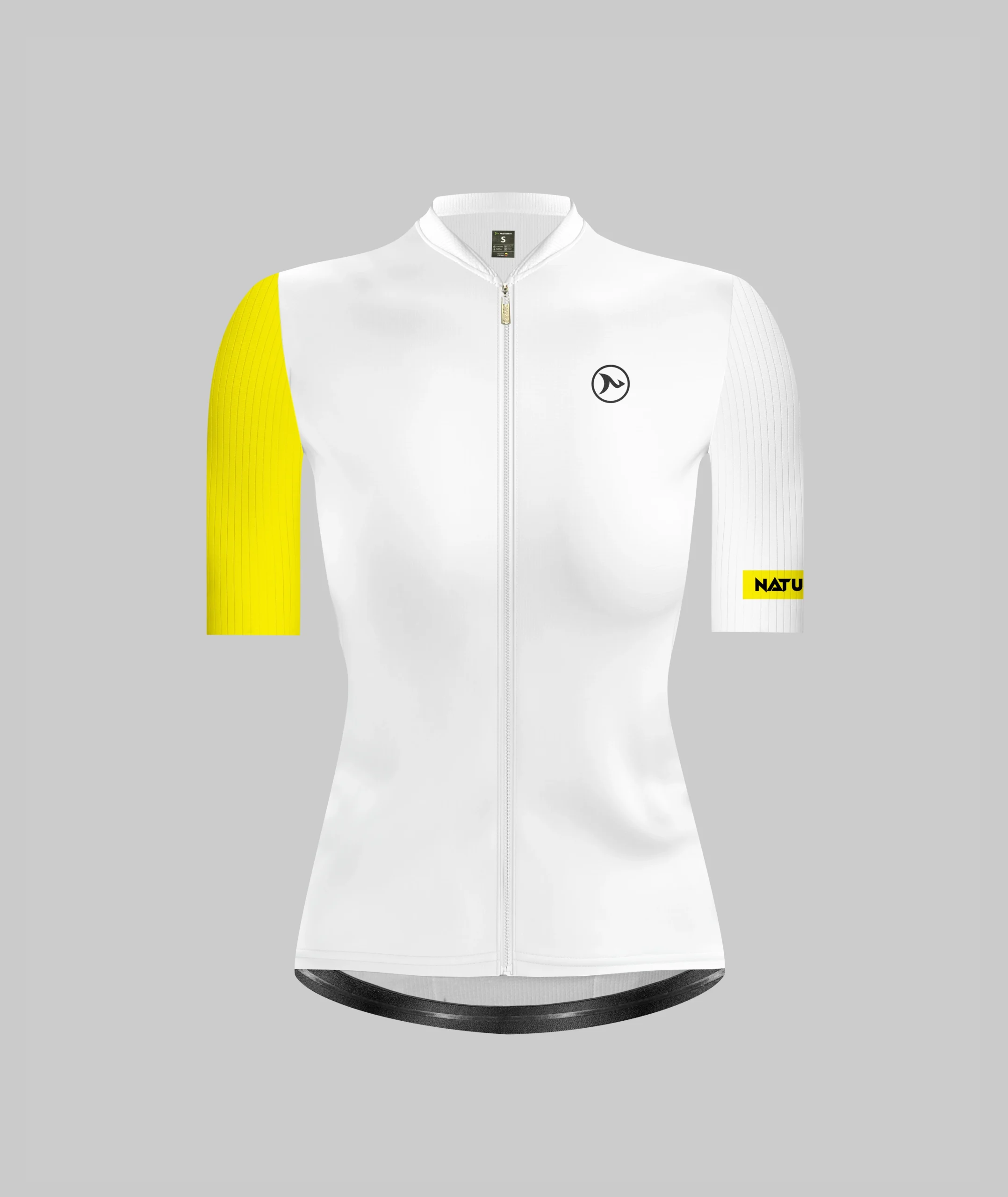Un diseño que vibra con energía. El Jersey Pushing combina la pureza del blanco con un toque audaz de amarillo intenso en una de las mangas, creando un contraste moderno y lleno de vitalidad. Este jersey transmite movimiento, decisión y actitud, ideal para quienes no le temen al protagonismo y disfrutan destacarse con estilo en cada rodada.
